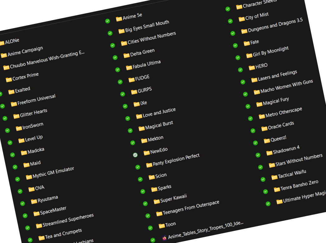 I’ve thought about putting together a new character concept I’ve been sketching over the past few months, Hikari Amaterasu. A overly optimistic, misfit of a Magical Girl. She’s a fun character too, but … I’m just not feeling it right now. In fact, I’ve got an entire squad of Magical Girls that I could through into a game. But yet, I still desperately want to play a game!